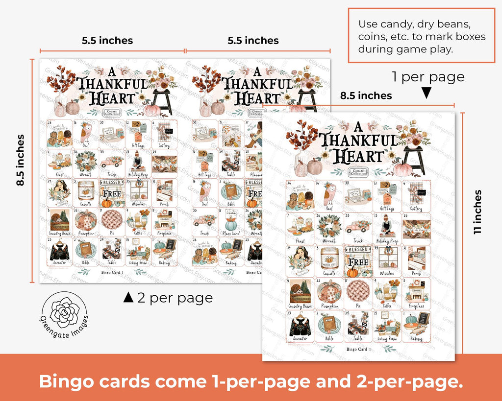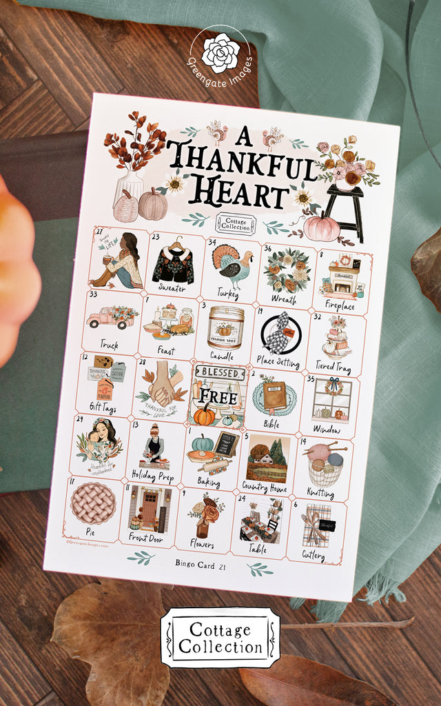 Fans of cottagecore and simple pleasures will love this beautifully illustrated bingo game. A Thankful Heart features cozy fall artwork celebrating life’s everyday blessings alongside classic Thanksgiving touches like pie, gatherings, and home comforts. It’s perfect for a wide range of occasions, including: