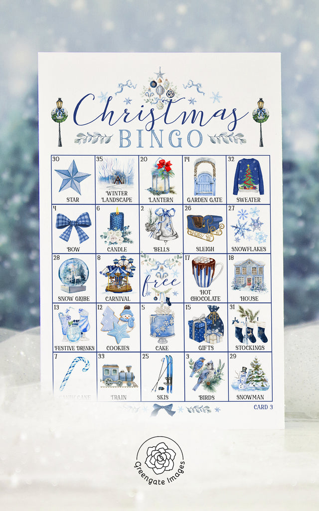 Whether you're throwing a Blue Christmas party or simply love cool winter tones, this unique bingo set brings a fresh twist to a classic holiday game. Featuring hand-painted watercolor artwork in many shades of blue, it includes timeless Christmas elements like ornaments, snowflakes, and gifts with a dreamy, elegant feel.