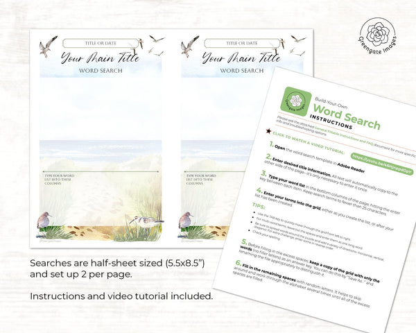 This is a printable word search template that allows you to create your own word find with your own terms and header text! This attractive activity page makes for a wonderful addition to your beach day, wedding reception, bridal shower, potluck, Mother's Day brunch, and more. Lay some out on the tables for guests to do while they wait for photography/food. Puzzlers of many ages will love having something to work on, plus it gives their eyes a break from screens.