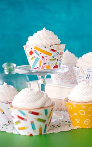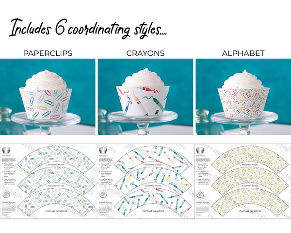 Bundle of 6 printable cupcake wrappers for school and office. These colorful wrappers include school or office supplies such as pencils, crayons, paperclips, as well as letters and numbers/math. Use any or all of the included designs for your ideal look. The colors coordinate with each other!