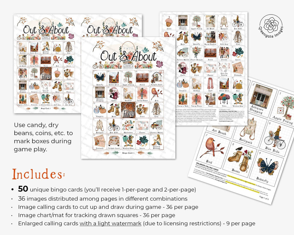 Fans of cottagecore and simple pleasures will love this beautifully illustrated bingo game. The set features cheerful artwork depicting various outdoor fall activities and elements one might encounter. It's perfect for a wide range of occasions, including: