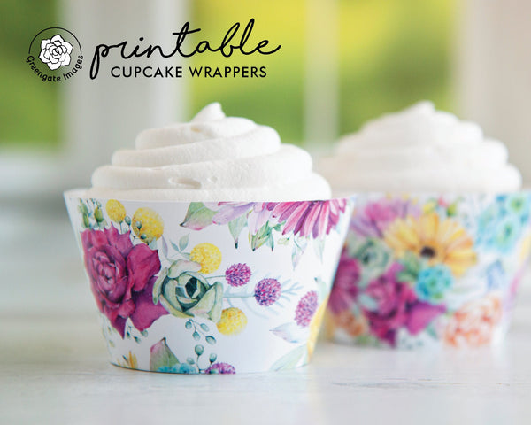 Pretty and vibrant floral cupcake wrappers with a fiesta vibe. Lots of flowers and succulents in shades of fuchsia, turquoise/aqua, warm yellow, green, blue, and orange. Perfect for colorful party decorations whether it's fiesta-style or not.