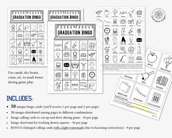 Celebrate your graduate with a fun game for all ages. Black and white Graduation Bingo cards for you to print and use over and over. Images include graduation/celebration/education objects and symbols.