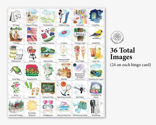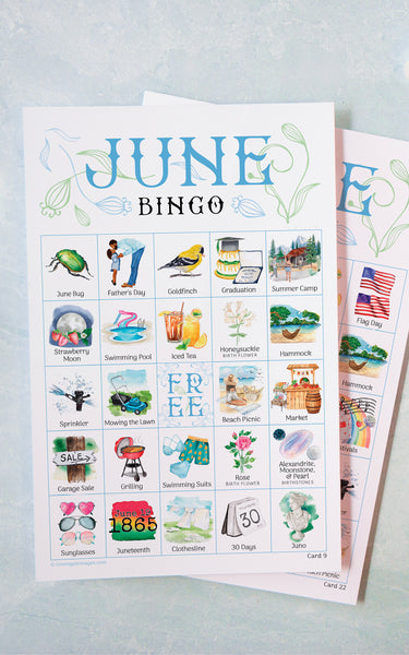 Printable June Bingo to celebrate the carefree 6th month. 50 unique cards included. Perfect for kids, families, and adults. Pictures depict various American holidays, symbols, and activities associated with June and summer. Beautiful watercolor art references elements such as: Juneteenth, festivals, sports events, swimming, graduation, in-season produce, outdoor activities, and much more. Even the month's birthstones and birth flowers are shown, as well as the full Strawberry Moon.