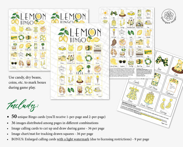 Tags: 50 PRINTABLE unique cards. Instant digital download PDF. Fun activity for lemon-themed bridal showers and birthdays. 50 card bingo, large group activity, senior center, 1 per page 2 page, labeled pictures, theme decorations, summer fruit event, cute and unique game, lemon party game, lemon-themed shower, lemonade stand idea, teenager sweet 16, ladies tea potluck
