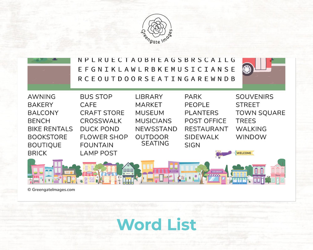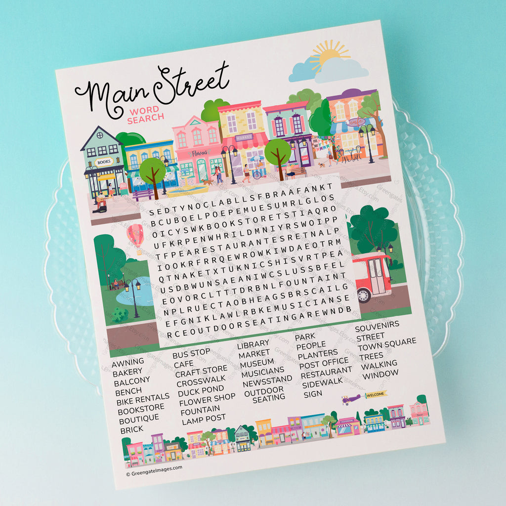 Relax your mind with this adorable Main Street–themed word search. I leveled up the cute for this one, because why not? The cheerful illustrations make it into a visual escape as well as a fun find-a-word.