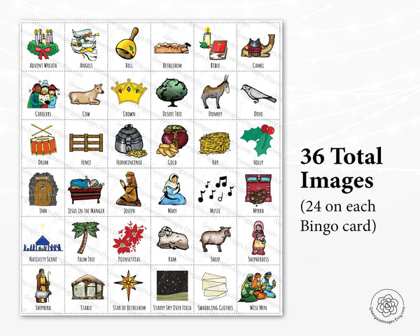 This nativity bingo set is a great way to help remind kids and adults of the birth of Christ. A great activity for Advent, Sunday School, homeschool, or anytime. Use again and again. Mark spaces with items such as candy, dry beans, or coins as someone calls out the images. Pictures are labeled to help avoid confusion. A full set of the the pictures is available to print, cut, and put in a bag to draw from. A second page serves as a mat to place called images on to keep track.