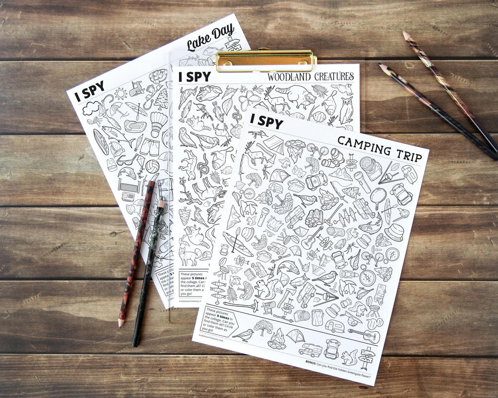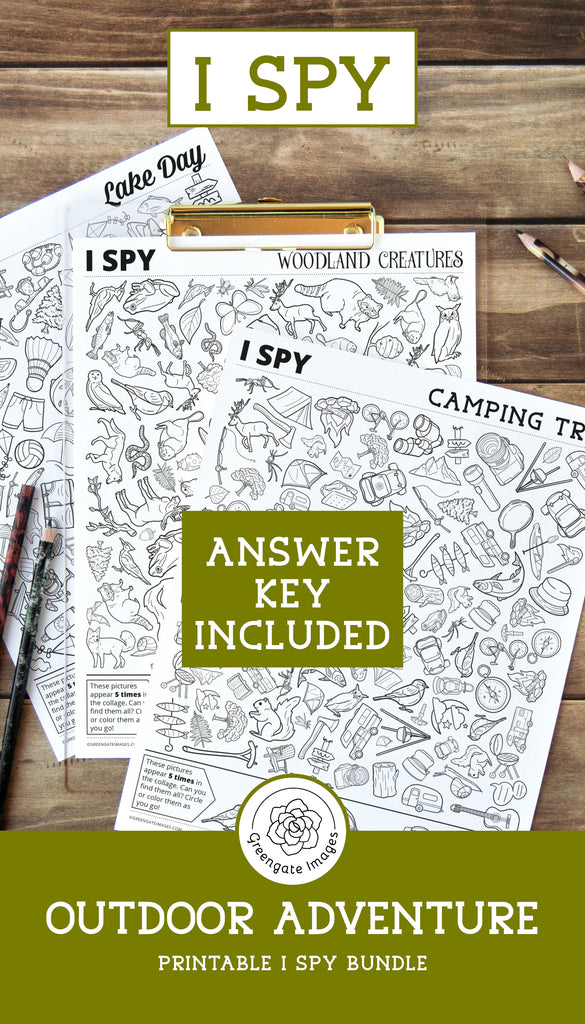 Tags: PRINTABLE - Answer Key Included! Three 8.5x11" pages: Camping Trip, Woodland Creatures, Lake Day. Download. I Spy Find It, Coloring Page, look for the picture, black and white game, road trip car ride, travel games kids, adults all ages, fun children pages, senior center hidden, seek find pictures, camping woodland, animals lake trip, forest creatures