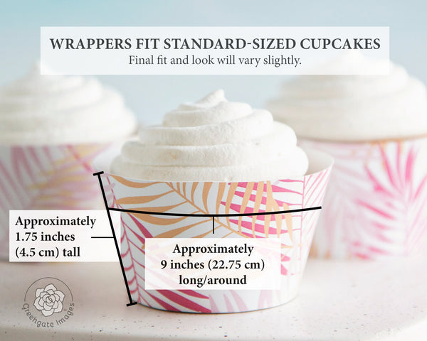 Wrappers fit standard-sized cupcakes and measure approximately 1.75" tall and 9" around.