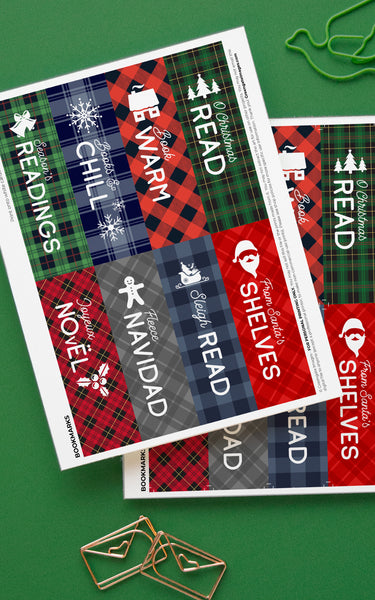 Tags: PRINTABLE instant download PDF. Small size 1.5x5" markers for goody bags, gift baskets, coworkers, book club. marks w plaid design, flannel pajamas pjs, holiday seasonal, slumber party gift, friends classroom, library staff party, gift bag goodie, favors small gifts, flat xmas card cute, stocking stuffers, book lover readers, teacher office idea, mini puns winter. Cozy book nook sleepover birthday book-themed event.
