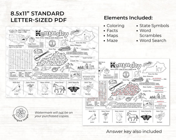 Tags: Instant download PDF kids games. KY state facts, word search, maze, unscramble 8.5x11" coloring placemat. activity placemat, word find-a-word, coloring page, black and white, elementary ages 7 up, entertain children, united states map, homeschool fun work, landmarks symbols, teacher classroom, 2nd 3rd 4th 5 grade, road trip geography, kentucky derby facts