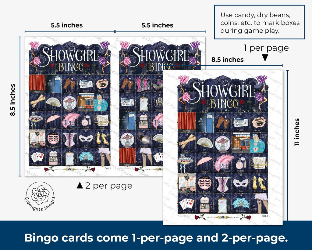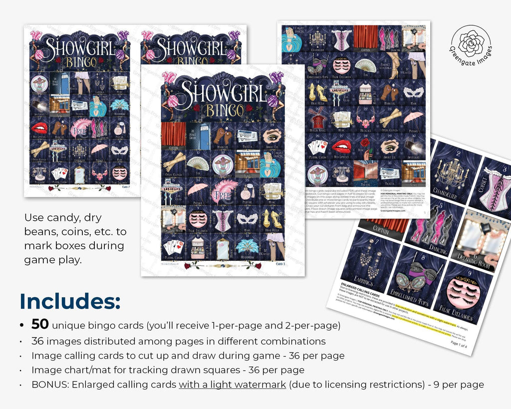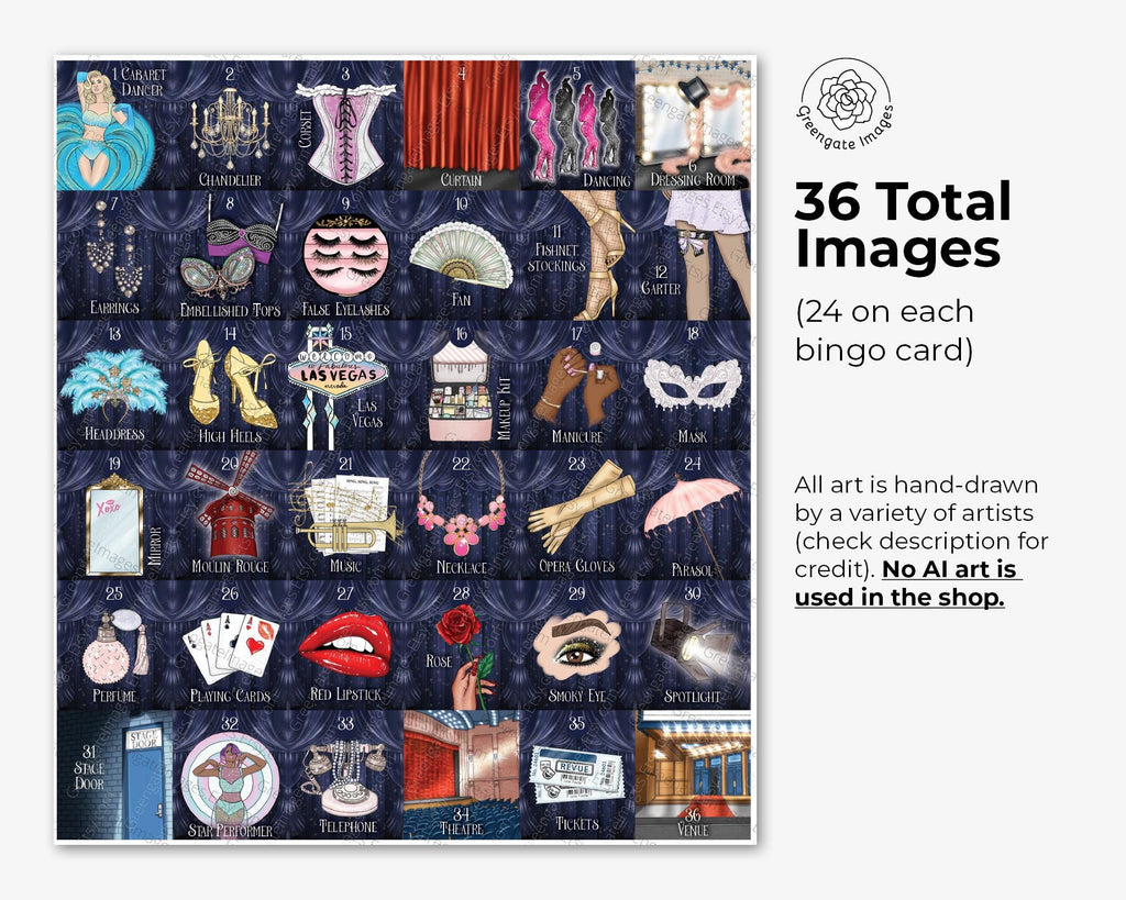 The squares feature hand-drawn images inspired by classic showgirl style: feathers, lights, makeup, music, and more. Itās family friendly and easy to play, with numbered pictures to keep things clear while calling.