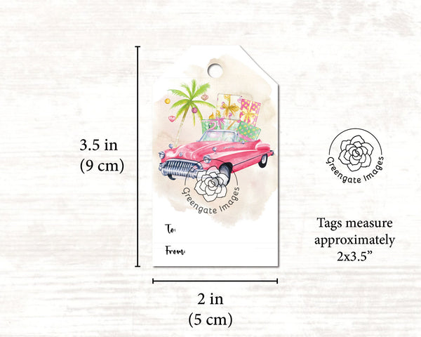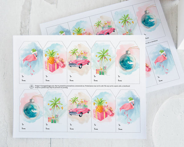 π΄ Quick and easy printable gift tags for Christmas presents and favors. With a super cute tropical design, these tags require no editing, so you can use them right away. Just print onto white cardstock, cut, and attach to gifts and favors. "To:" and "From:", with space to write names, are provided on the bottom.