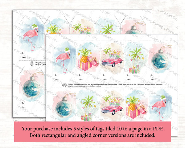 Tags: PRINTABLE 2x3.5" tags PDF page. To & from space included. Instant digital download, fun, beachy, hawaiian. christmas gift tags, favor tag ideas, write in names, don't have to edit, ready to print, multiple designs, angled corner style, coordinating hang, warm weather xmas, unique florida idea, cruise vacation, flamingo pineapple, beach palm tree luau island
