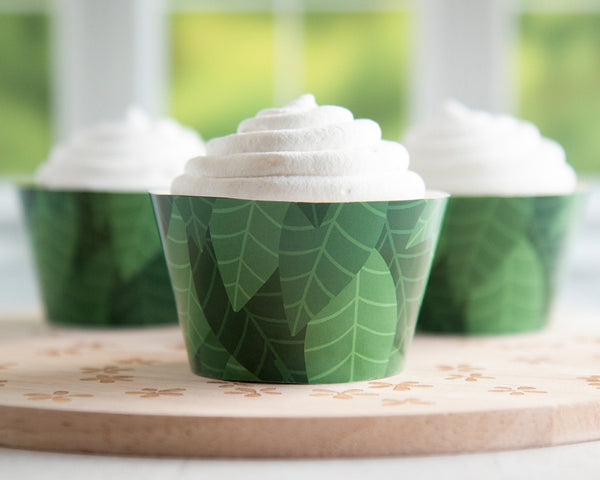 Printable tropical leaf cupcake wrappers. Simple yet vibrant, these wrappers are nice for luau and Hawaiian-style events. Add a pop of bold green to your dessert table.