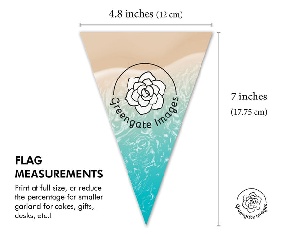 Pretty bunting with a beach theme. These printable bunting flags feature foamy AQUA/TURQUOISE water lapping up on a sandy beach. Perfect for your beach- or boating-themed event!