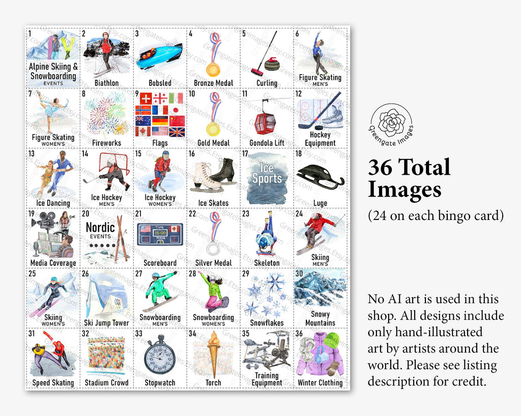 Tags: 50 PRINTABLE unique cards. Instant digital download PDF. Fun game/activity idea for games viewing parties and more. 50 card bingo, large group activity, senior center, labeled pictures, assisted living care, party idea game, hand-painted artwork, sports watch fun, athletic competition, international global, skiing ice skating, luge bobsled hockey, two sizes watercolor
