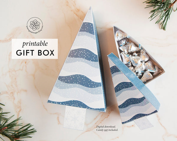 Super cute Christmas tree gift boxes that you print and assemble yourself. Print as many as you need for personal use! This wintry design features shades of dusty blue with snow.